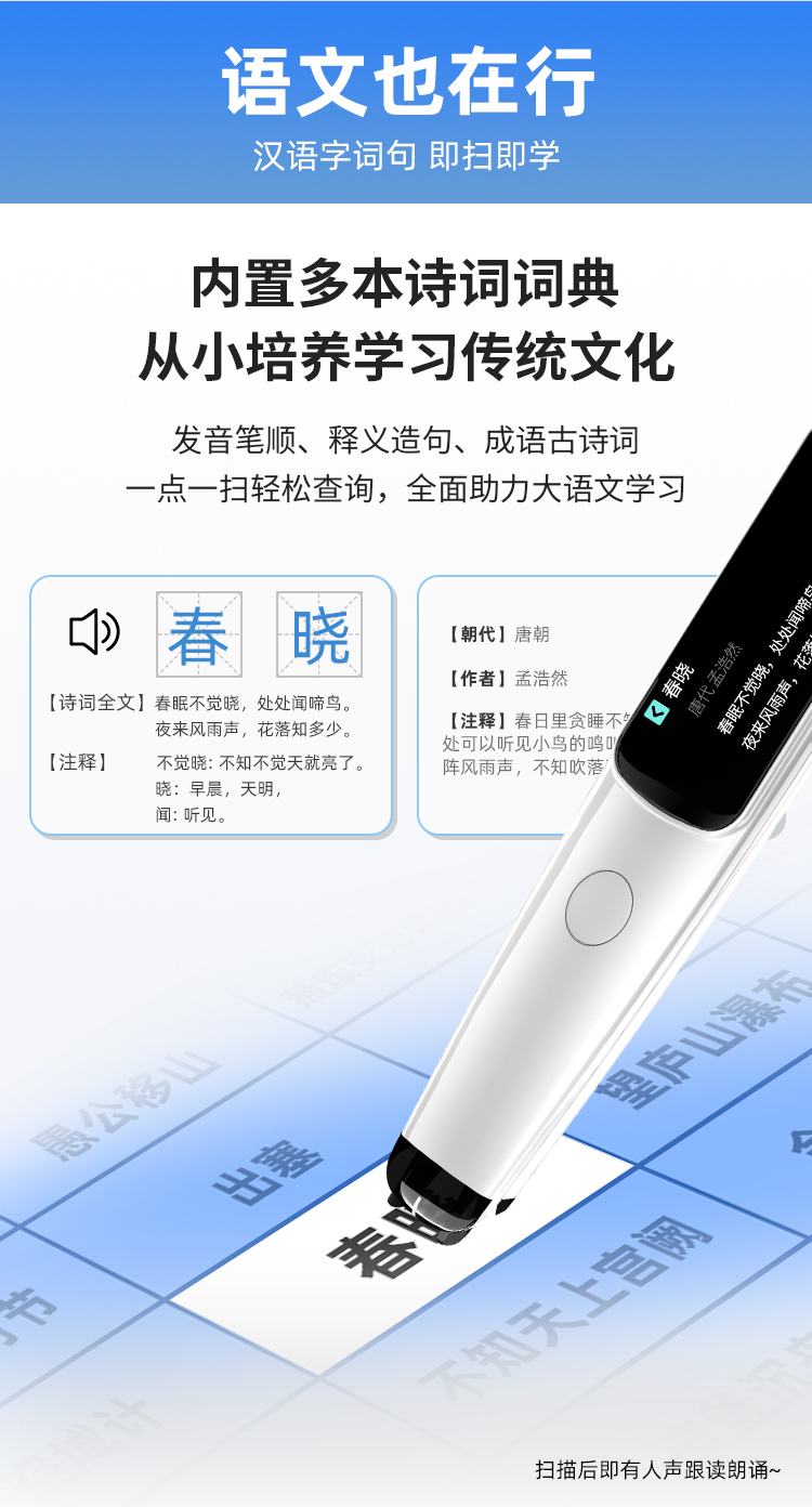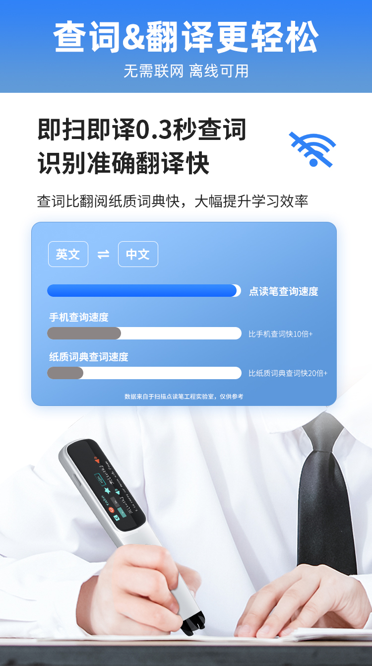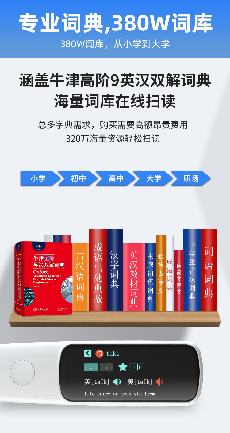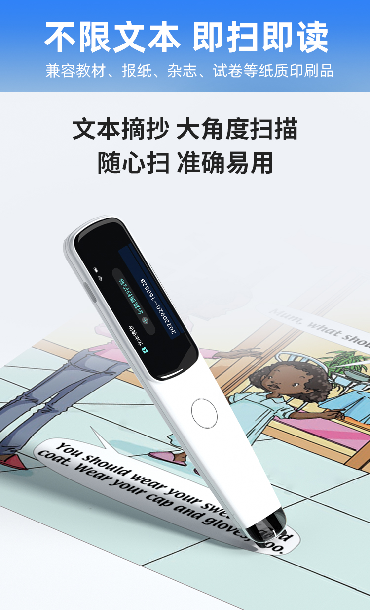 学之友扫描词典笔方案,基于linux/Android系统开发,采用学之友自主研发的拼图算法、OCR文字识别算法、文本翻译算法、语音翻译算法及AI算法等,支持多语种离线/在线扫描翻译、拍照取词翻译、语音翻译、课本点读、课本扫读、AI互动、家长管控、WIFI上网、蓝牙传输、TCP协议,这是一款性价比较高的方案,适用于1.65英寸/1.9英寸/2.23英寸/2.98英寸/2.99英寸/3.12英寸/3.46英寸/3.7英寸/5英寸等。